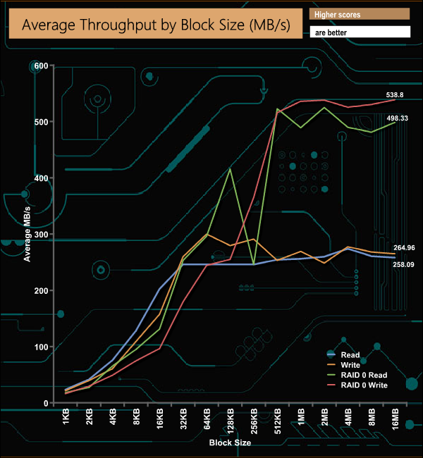 In our throughput test, there was a sudden drop in read performance at the 256KB block mark but the array recovered quickly to finish the test run at 498MB/s.