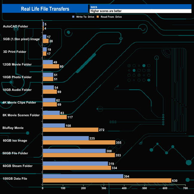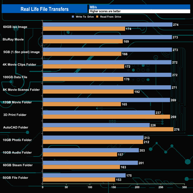 The IronWolf Pro 20TB drive had no problems dealing with any of our real-life file transfers and produced pretty consistent performance when it came to handling the larger file sizes with an average write figure for the seven large file transfers of 272MB/s with reads at 172MB/s. The slowest of the file transfers was the 50GB File Folder, full of small bity files, with reads at 153MB/s and writes at 175MB/s.