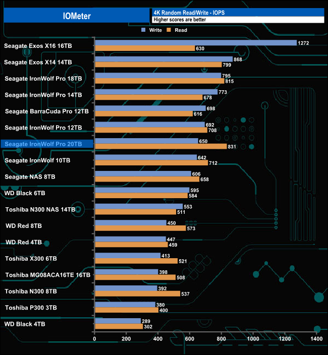 In our 4K random read/write test, the drive produced a write figure of 650 IOPS, which is slower than some other capacities of the IronWolf Pro we've tested. However, its read result of 831 IOPS is the fastest we've seen to date for an HDD.