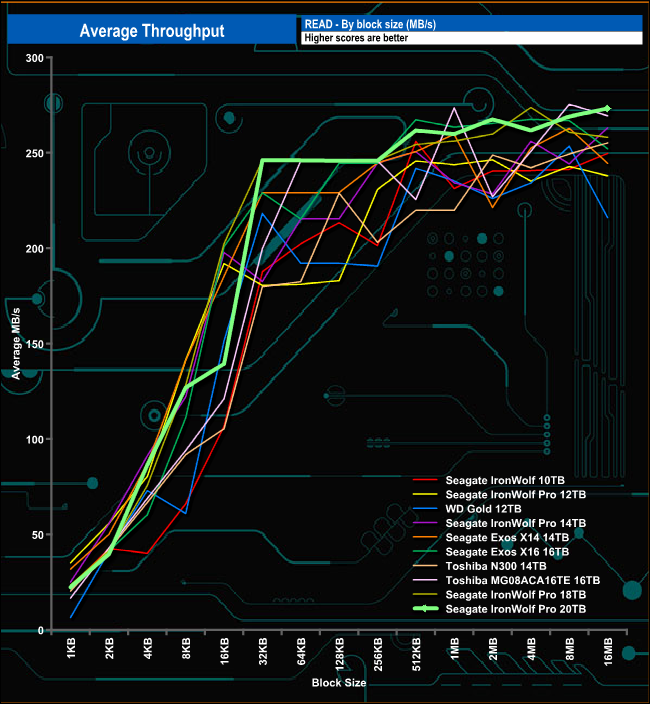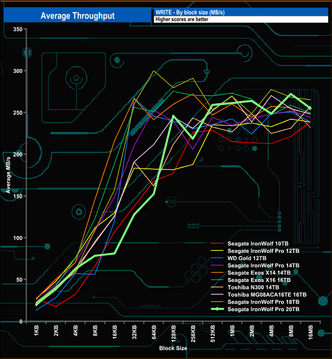 In our throughput tests, the 20TB IronWolf Pro finished the read run at 273MB/s, a little shy of the official maximum of 285MB/s. Writes were further back at 255MB/s.