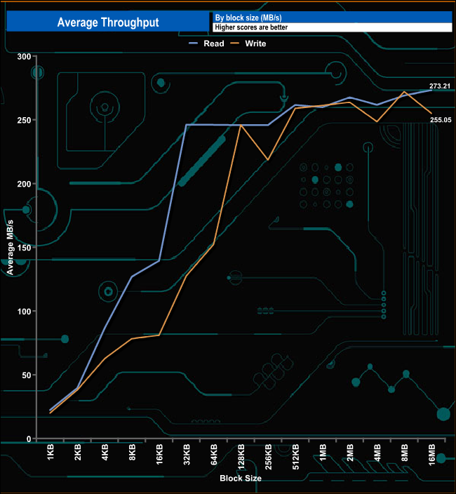 In the read throughput test, the drive peaked at the end of the test (16MB block mark) at 273.21MB/s.