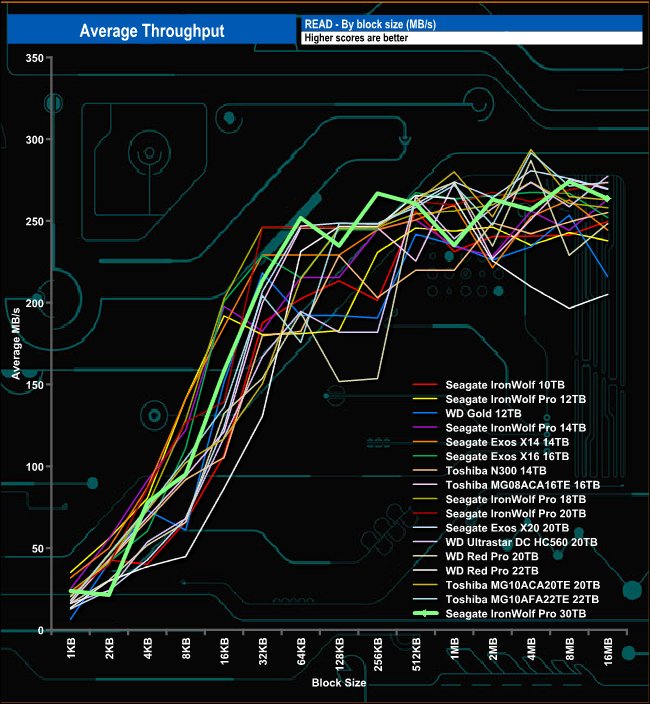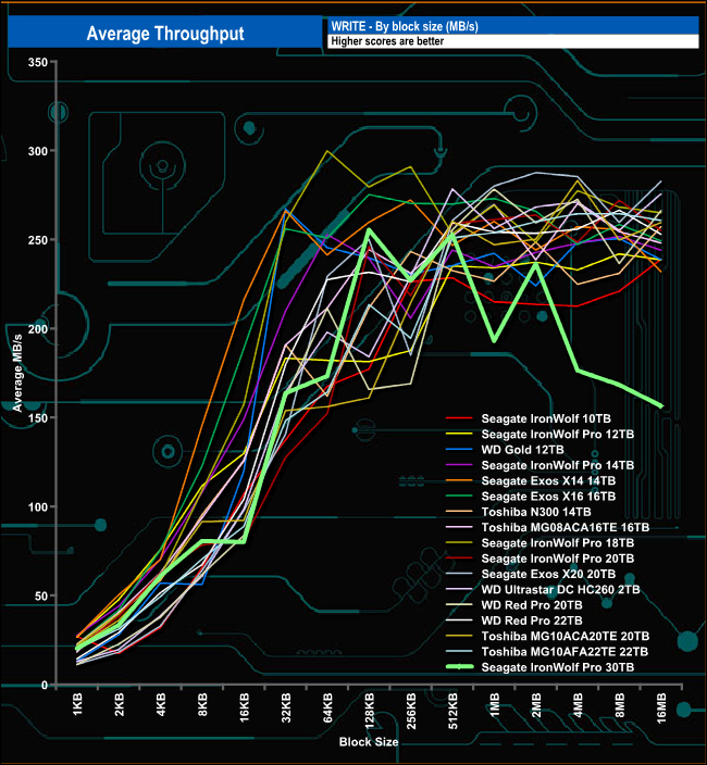 In the write throughput test, the 30TB IronWolf Pro peaked at the 128KB block mark at 255.52MB/s before dropping back erratically until the end of the test run.