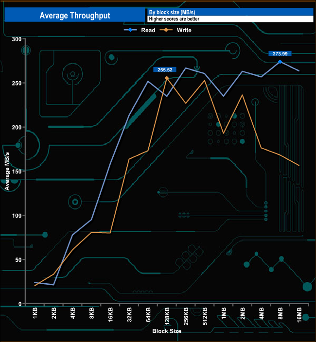 In the read throughput test, the drive peaked at the 8MB block mark at 273.991MB/s before falling back slightly at the end of the test run.