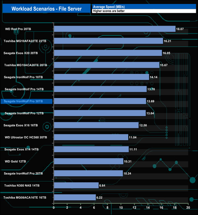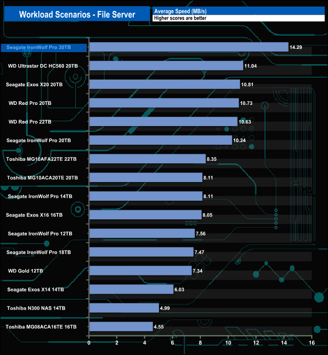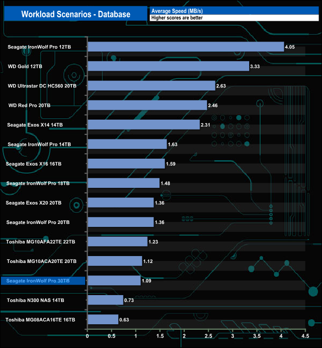 The 30TB IronWolf Pro handled the workload scenarios pretty well, with the fastest bandwidth speeds we've seen to date for the File Server test (14.29MB/s). The Web Server test sees the drive in a mid-table position, while for the Workstation test, the drive sits in fourth spot. It didn't fare so well in the Database test with a bandwidth figure of 1.09MB/s which sees it near the bottom of the results chart.