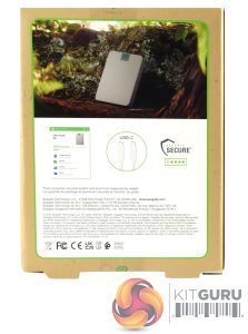 The back of the box has illustrations of the Seagate Toolkit splash window and a USB-C cable along with a Seagate Secure logo.