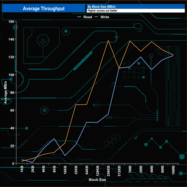 The throughput test results from the drive are pretty erratic, to say the least. Read performance peaked at the end of the test at the 16MB block mark at 121.38MB/s. The write performance was a little better, peaking at 138.66MB/s (256KB block) before eventually completing the test run with a figure of 122.26MB/s.