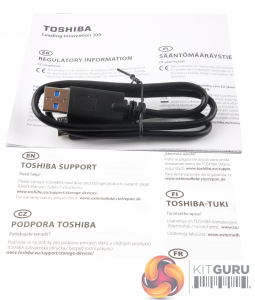Apart from the drive all that is in the box is a USB 3.0 Type A to Micro-B cable, which could do with being a little longer for PC connections, and two paper information leaflets, one with details on how to contact Toshiba support and the other providing regulatory information. The Canvio Advance's manual comes pre-loaded on the drive itself.