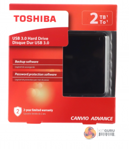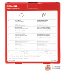 The Canvio Advance comes in a stout box with a largish panel cut into the front of it, giving a view of the drive in its inner packaging. The drive's capacity is displayed on the top right of the box while warranty information is displayed at the bottom left. The rear of the box is has multilingual information about the Backup and Password Protection software downloads.