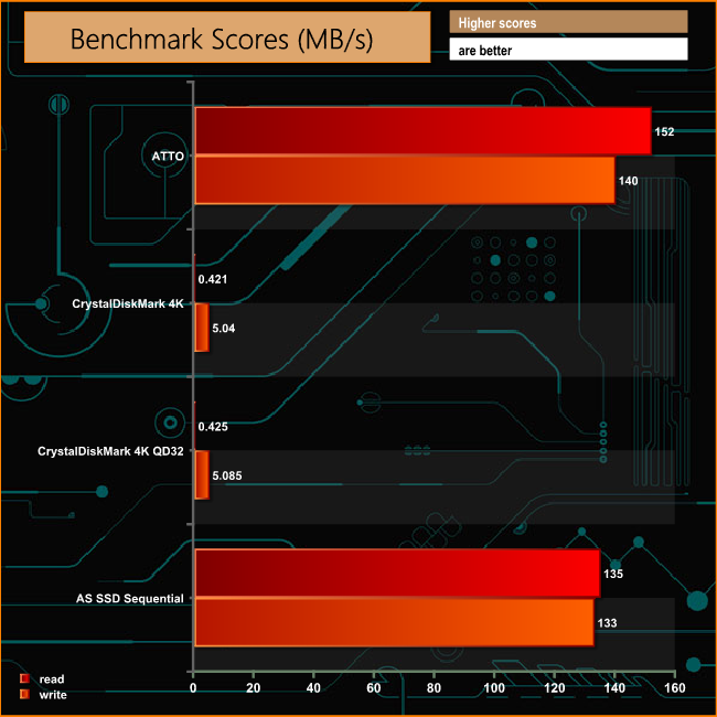 The sequential read/write scores are what you might expect from a 5,400 rpm drive over a USB3.0 interface. The two CrystalDiskMark Random 4K write scores at 5.04MB/s at a queue depth of 1 and 5.085MB/s at a queue depth of 32 are very good.