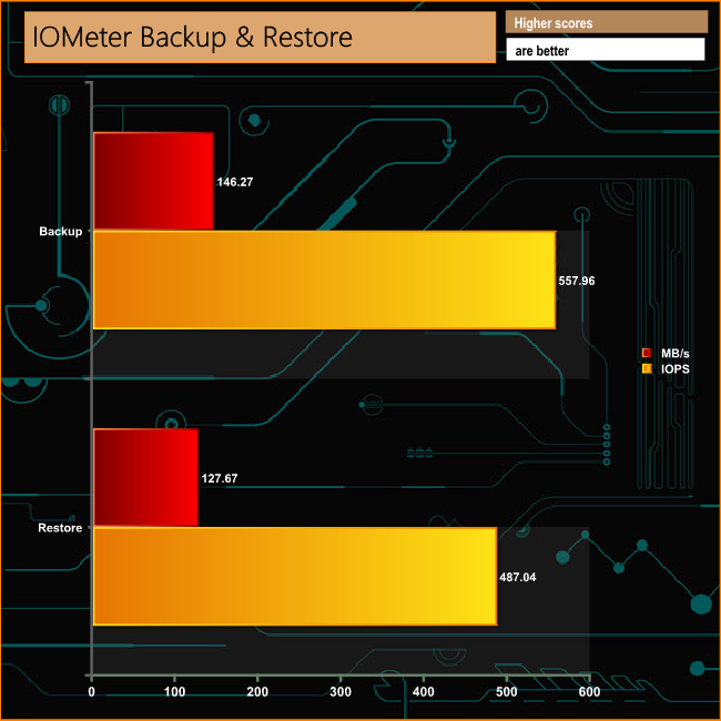 We set IOmeter up (as shown above) to test both backup and restore performance on a 100GB file.