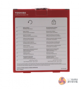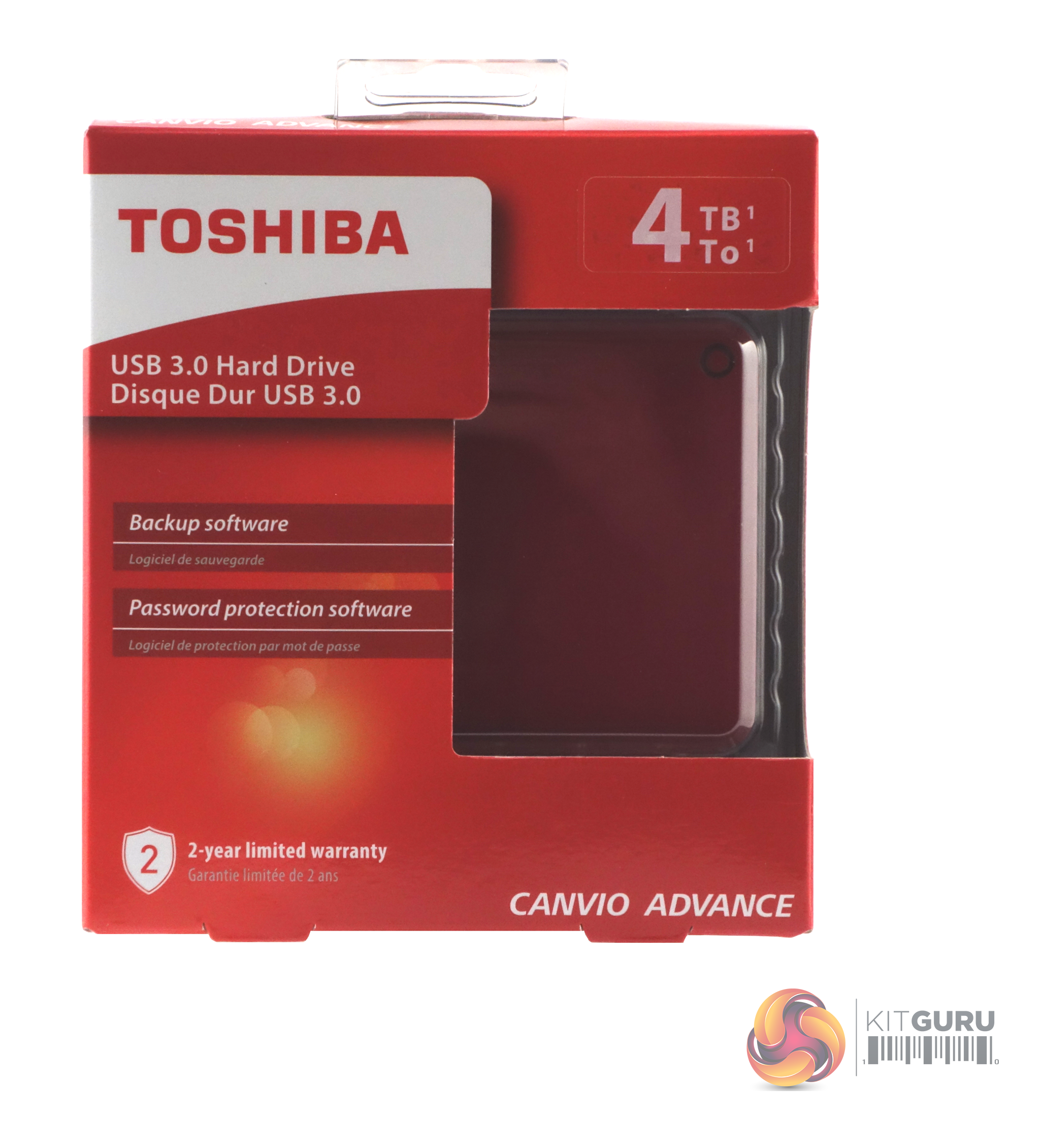 The Toshiba Canvio Advance comes in a stout box with a largish panel cut into the front of it, giving a view of the drive in its inner packaging. The drive’s capacity is displayed on the top right of the box while warranty information is displayed at the bottom left. The rear of the box is has multilingual information about the Backup and Password Protection software downloads.