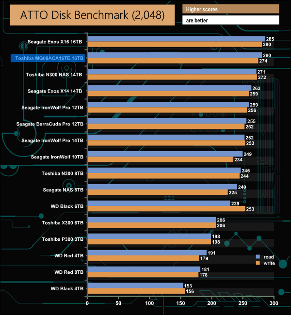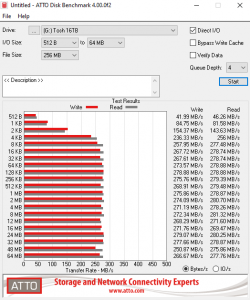 The official Sequential read/write rating for the MG08 range is up to 262MB/s. With the ATTO benchmark, we were able to better those figures, with the review drive producing a read figure of 280MB/s with writes at 274MB/s.