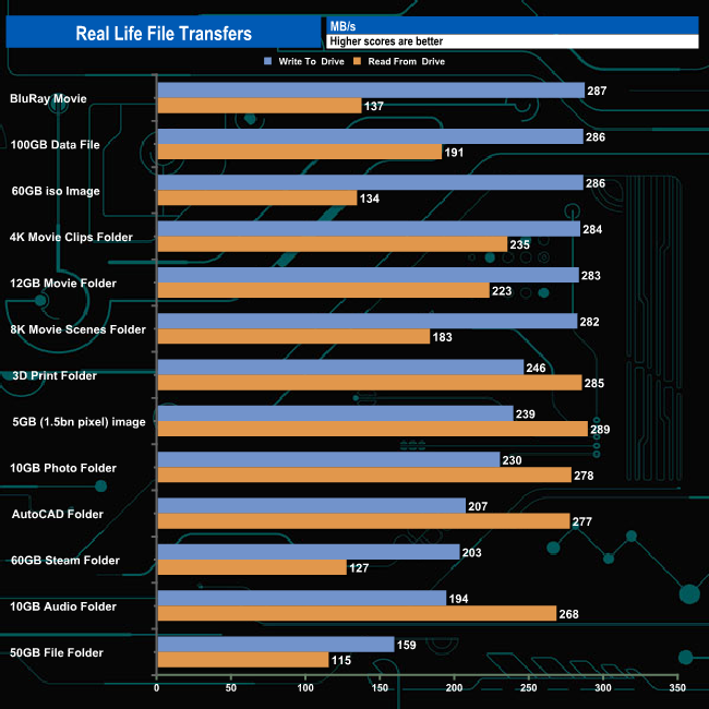 The MG10 produced very consistent performance when it came to handling the larger file sizes with an average write figure for the six large file transfers of 284MB/s. The fastest write performance was the BluRay movie at 287MB/s while the fastest read speed came from the 5GB image transfer at 289MB/s. The slowest of the file transfers was the 50GB File Folder, full of small bity files, with writes at 159MB/s and reads at 115MB/s.