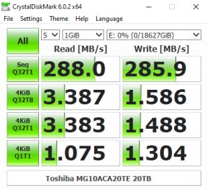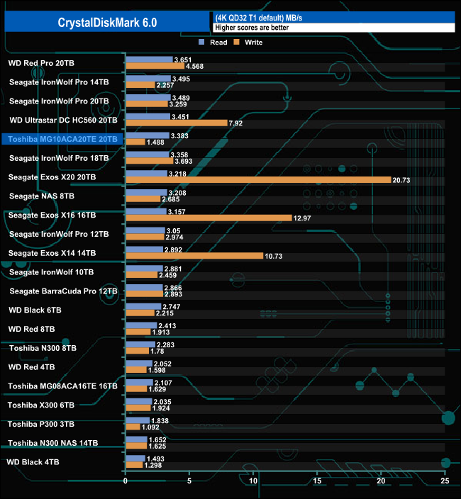 In the CrystalDiskMark 4K QD32 T1 test, the 20TB MG10 read test result of 3.383MB/s sees it sitting in fifth place in our results chart. However, its write result of 1.488MB/s is nowhere near as impressive.