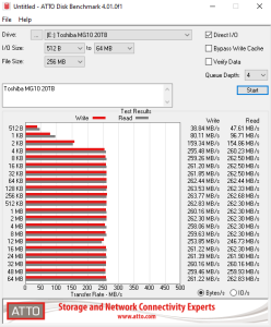 Toshiba rate the sustained transfer rate of the 20TB MG10 as 268MB/s, a figure we can confirm with the ATTO benchmark test results of 262MB/s for both reads and writes.