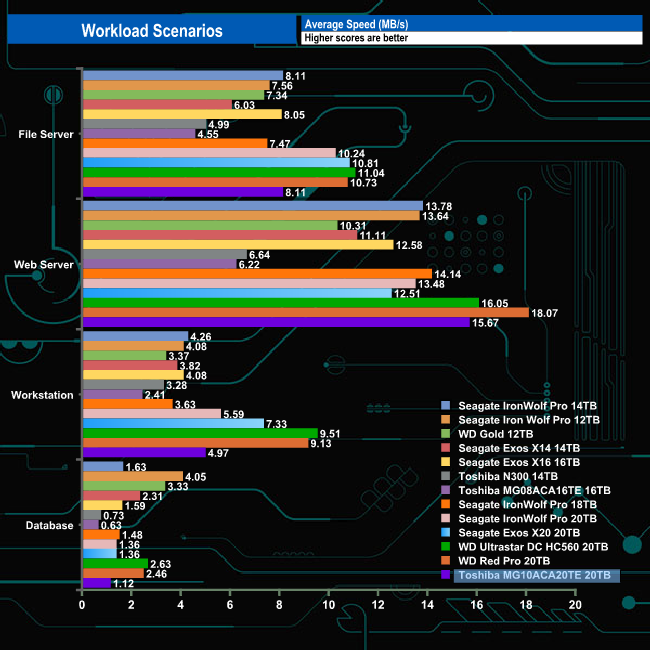 The 20TB Toshiba MG10 handles the Web Server trace the best out of the four tests with a result figure of 15.67MB/s, the third fastest we've seen to date for this particular test.
