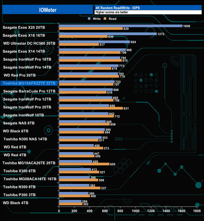 We test with both random read and write 4k tests, as shown above. There are many ways to measure the IOPS performance of a hard drive, so our results will sometimes differ from the manufacturer’s quoted ratings. We test all drives in the same way, so the results are directly comparable.