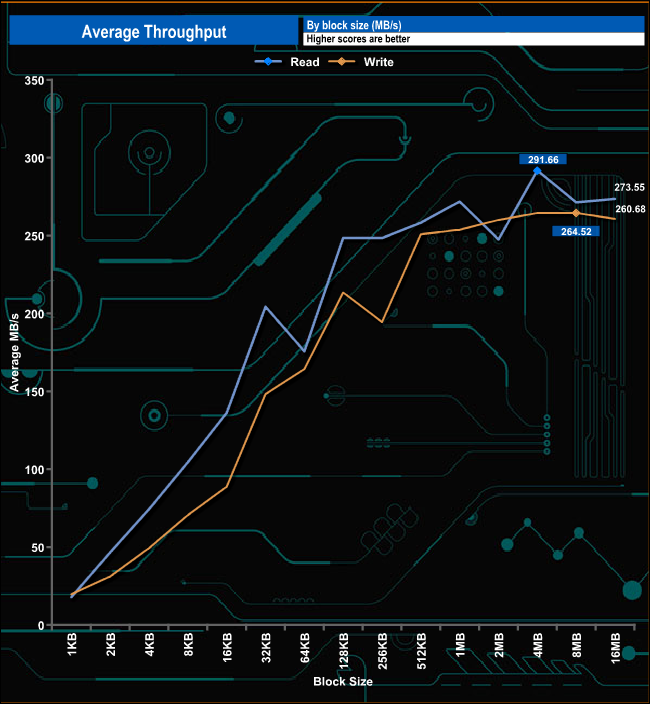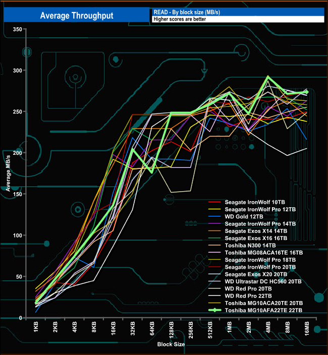 Toshiba quoted a transfer rate for the 22TB MG10 of 271MB/s. In our read-throughput test, the drive peaked at 291.66MB/s (4MB block) before dropping back to 273.55MB/s at the end of the test run (16MB block). Writes peaked at 264.52MB/s (8MB block) before finishing the test run at 260.68MB/s.