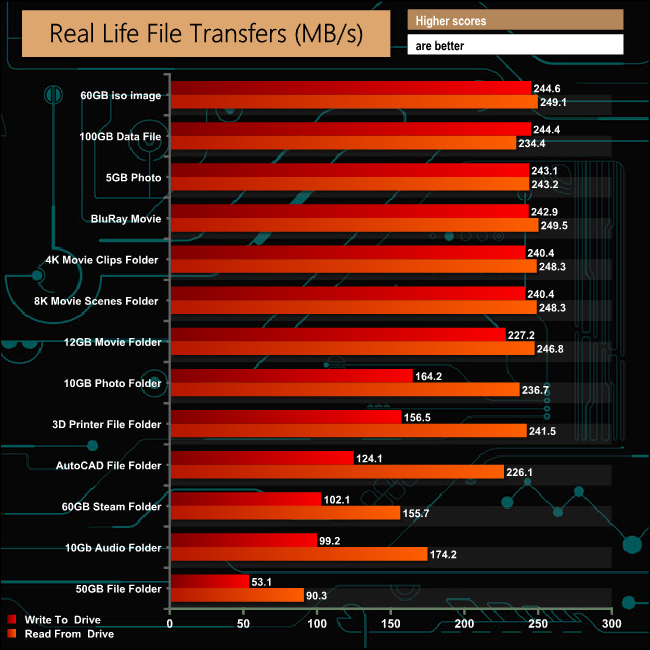 The N300 dealt with the real life file transfers pretty well. The 60GB Steam folder and in particular the 50GB file folder transfers are ones that quite often cause problems in terms of slowing a drive down, as it proved with the N300, but apart from those and the 10GB Audio folder, it dealt with transferring the files very efficiently.