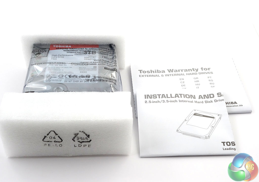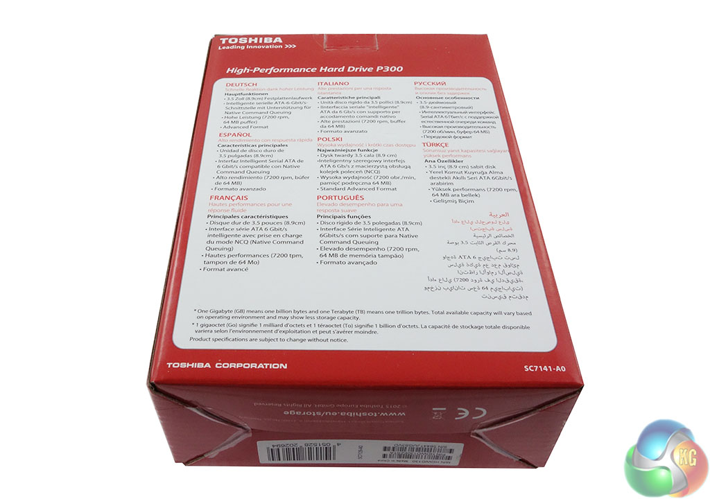 The front of the box shows an image of the drive (without a lid) and good clear descriptions of its capacity, spin speed and cache. The back of the box has a panel of multilingual statements of the drive's features. Also packed in the box are a quick start guide and a warranty leaflet.