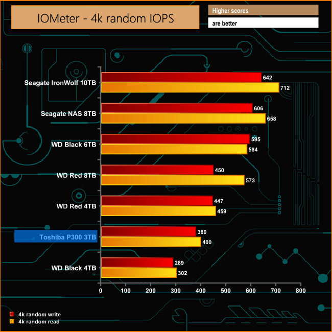 The 4K random read/write IOMeter test finds the Toshiba P300 sandwiched between the two WD 4TB drives. Both its read and write performance is considerably quicker than the 4TB WD Black although both figures fall short of WD's Red drive performance.