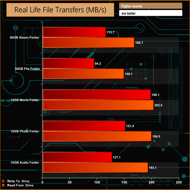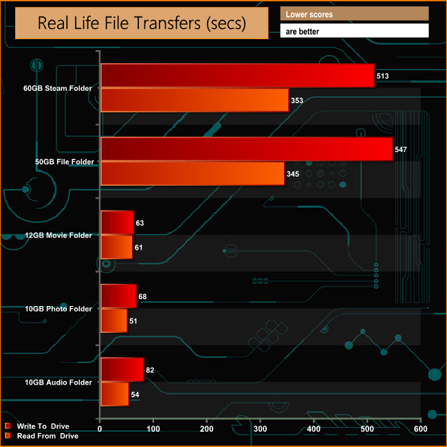 The real life file transfer tests all top the 100MB/s mark with the exception of when the drive is writing the small files of the 50GB Folder test when it drops to 94.2MB/s. No surprise then, that this file transfer is also the slowest taking just over nine minutes to complete. Of the multimedia tests, the drive is slowest when writing the contents of the 10GB Audio folder to the drive.