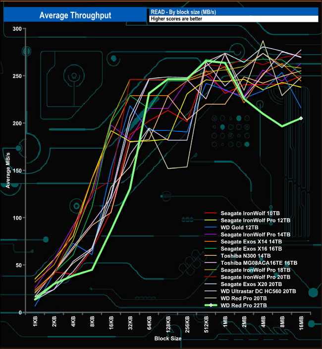The 22TB Red Pro's peak read result of 266MB/s confirms the official rating of 265MB/s before it starts to fall back against its competitors.