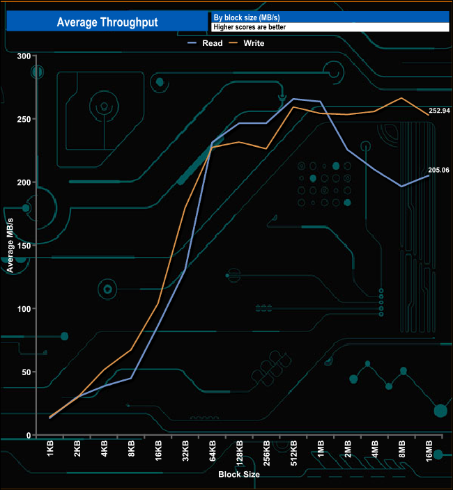 In our throughput tests, the reads peaked at 266MB/s (8MB block) before falling back to finish the test run at 205.06MB/s. Writes peaked further back in the test run at the 512KB block mark at 265MB/s, confirming the official figure, before dropping back to finish the test run at 252.94MB/s.