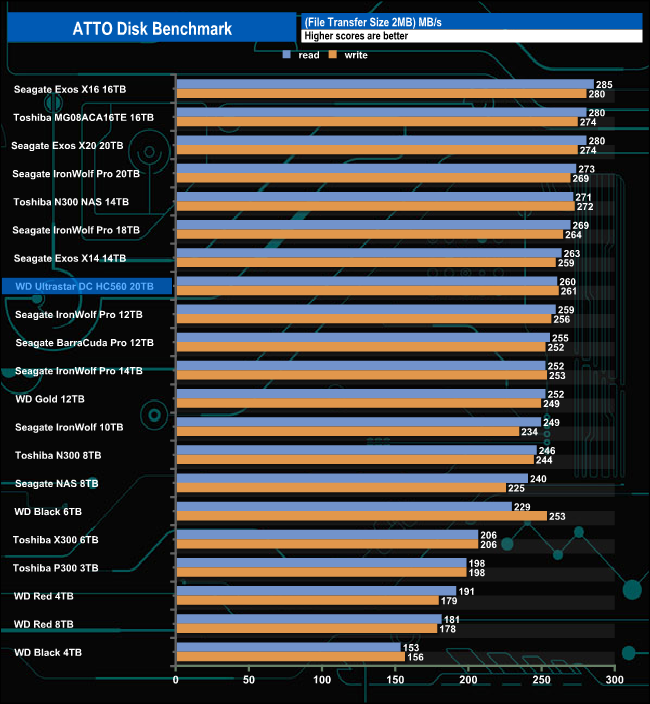 WD quote a maximum sustained transfer rate of 269MB/s for the drive. Using the ATTO benchmark we could confirm that figure with test results just shy of the maximum figure with reads at 260MB/s and writes of 261MB/s.