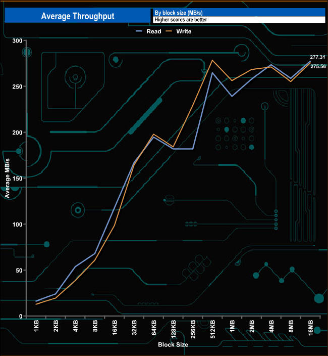 In our throughput tests, reads peaked at 277MB/s (16MB block) while writes peaked at the 512KB block mark at 278MB/s before dropping back very slightly to finish the test run at 275MB/s. Both peak figures confirmed the official maximum transfer rate of 269MB/s.