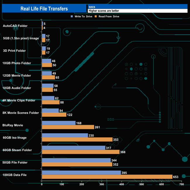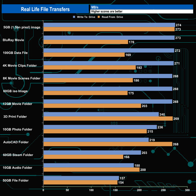 The WD Ultrastar DC HC560 20TB drive had no problems dealing with any of our real-life file transfers and produced pretty consistent performance when it came to handling the larger file sizes with an average write figure for the seven large file transfers of 270MB/s with reads at 196MB/s. The slowest of the file transfers was the 50GB File Folder, full of small bity files, with writes at 154MB/s and reads at 157MB/s.