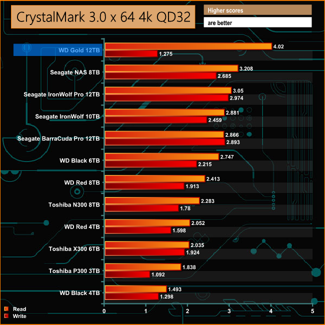 When dealing with random small bity files at a deep queue depth, the WD Gold 12TB is very much a mixed bag. Its read performance makes it the fastest HDD drive we've seen to date but its write performance by comparison is disappointing.