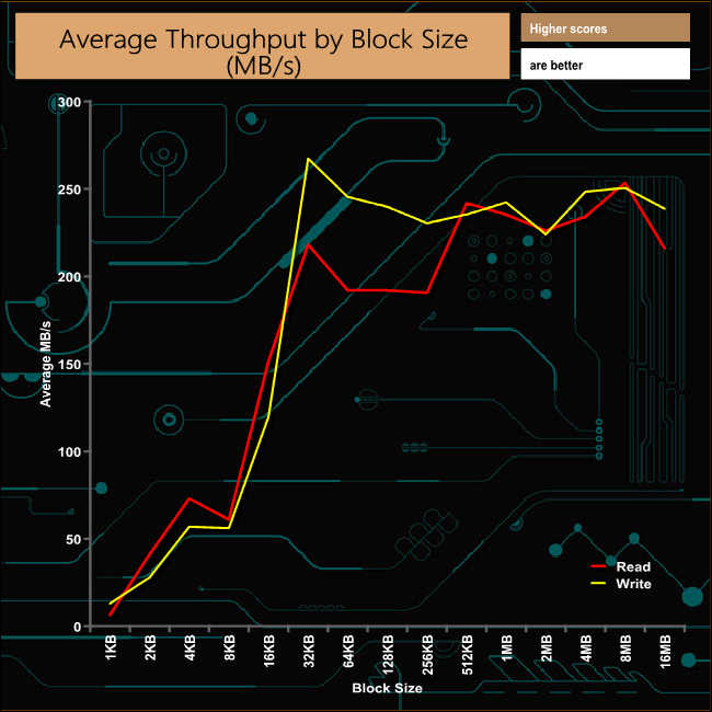 In the throughput test, the drive's performance plateaued out between 4KB and 8KB blocks sizes for both read and writes before the write performance raced away to a peak of 267.27MB/s at a 32KB block size. Reads were slower to reach their peak, which came at the 512KB block stage at 241.83MB/s.
