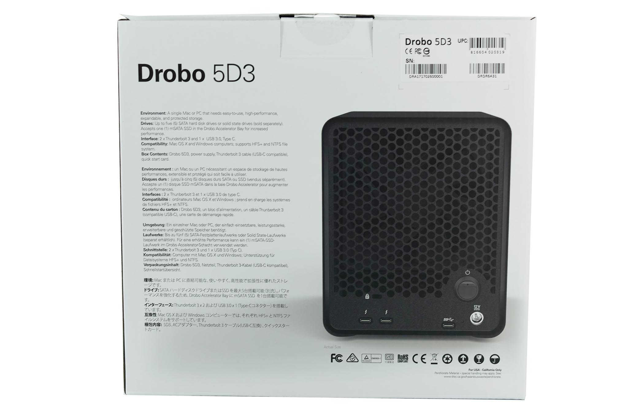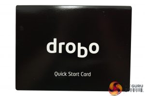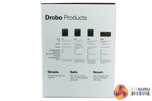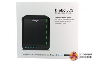 The Drobo 5D3 ships inside a large white box with some high resolution images and specifications of the DAS on the sides. The front of the box shows an ‘actual size' photograph of the product itself. Not much use to anyone buying it online, but ideal for someone in a store.