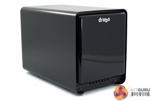 The Drobo 5D3 is a simple black DAS with a reflective plastic panel on the front. This panel is not held in place with screws, but with a special magnetic style surface that attracts and holds the cover in place.