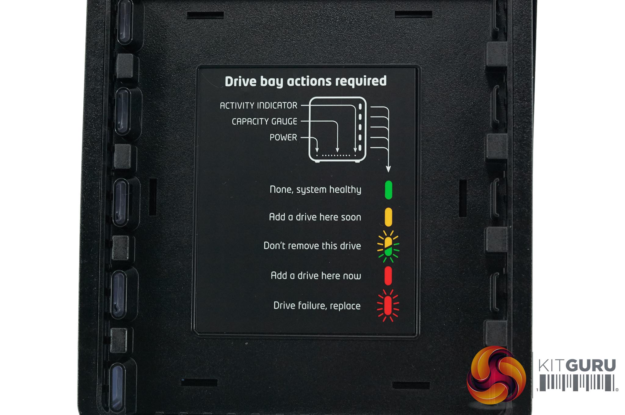 As more space is used, more of these lights will glow blue. When they are all full, one of the drive bay LEDs will indicate that a blank bay should have a drive fitted, or that one of the already occupied bays needs a larger drive installed.