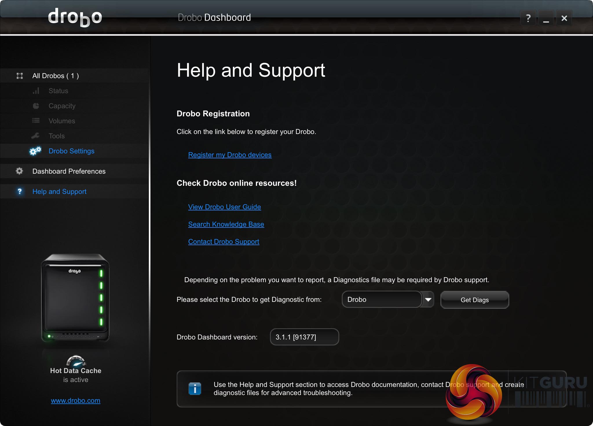 The final page entitled ‘help and support' gives quick easy access to Register your Drobo device, alongside viewing user guides, searching the knowledge base and contacting Drobo support directly. There is also an option here to create a diagnostics file to send to Drobo, if necessary. As the image shows we are using the latest V 3.1.1. (91377) of Drobo Dashboard.