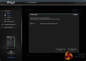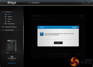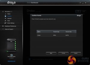 The Drobo dashboard then requested a format of the 5 drives installed. I agreed and within a couple of minutes the software sent an alert to say the process was complete. A maximum partition size of 64TB is possible if you have big enough drives!