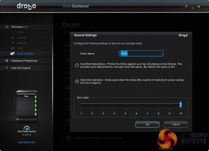 The General settings panel: While Drobo default the protection system to a single drive, if the data you are storing is extremely important then you can set it for Dual Disk Redundancy for added peace of mind. You can also DIM the lights here on a scale of 1-10.