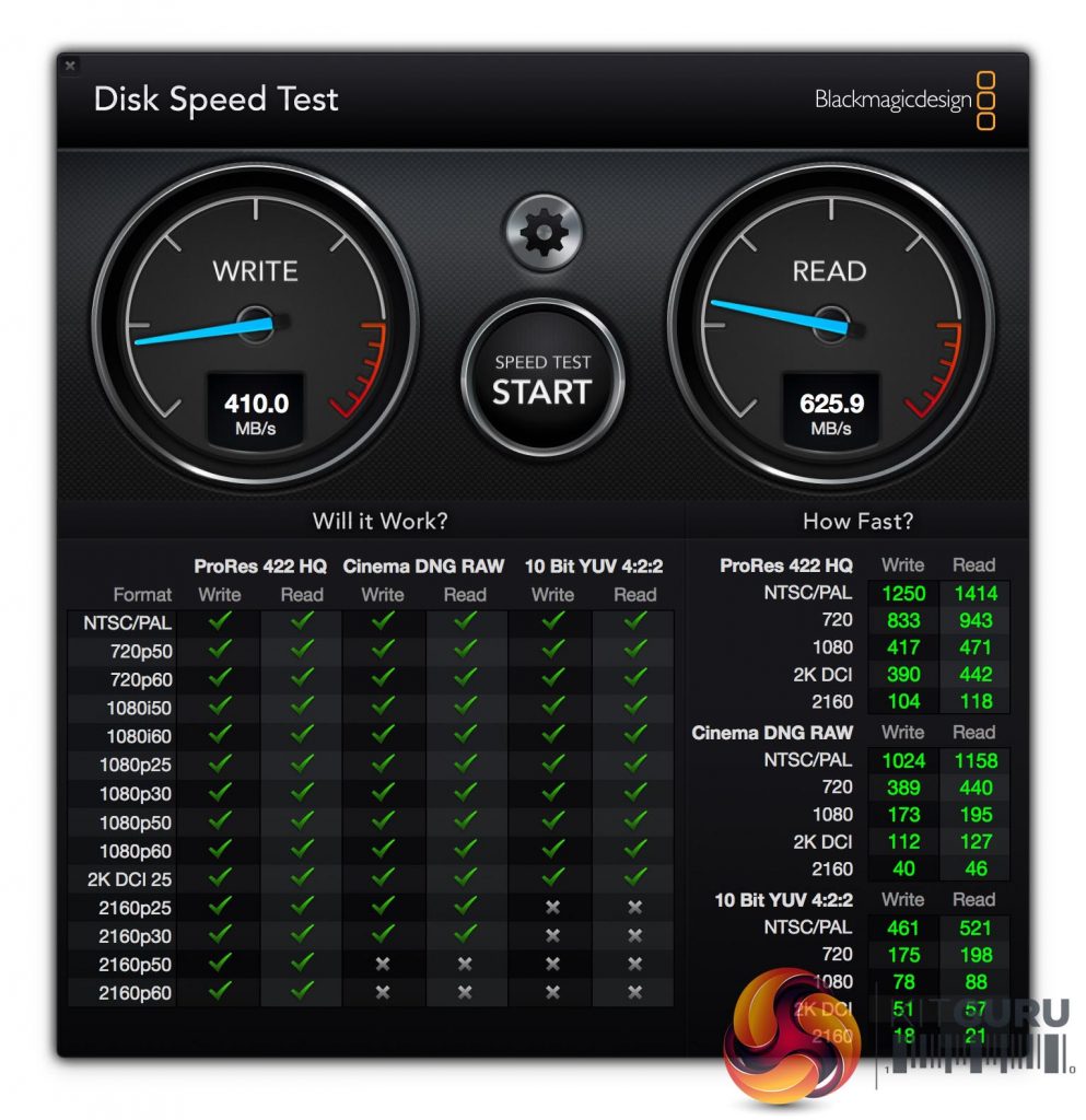 The BlackMagic Disk Speed Test is useful and I have used it many times in the past when testing drives on Apple. We can see some really strong results in this benchmark – generating 410 MB/s write and 625MB/s read results.