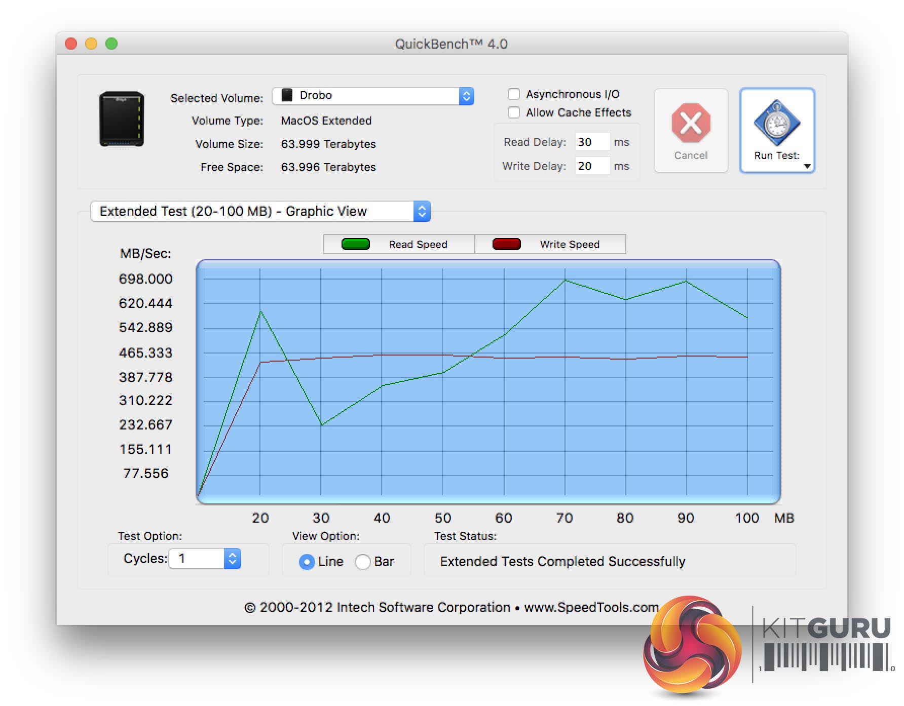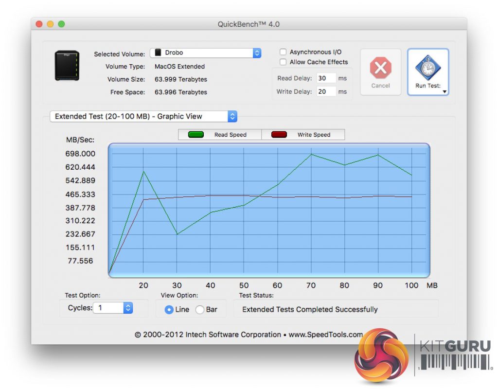 Quickbench 4.0 is part of the Speedtest set of tools and its reliable software I have used for many years on the Apple platform. Write speeds are constant at around 460MB/s and read results peak at close to 700MB/s.