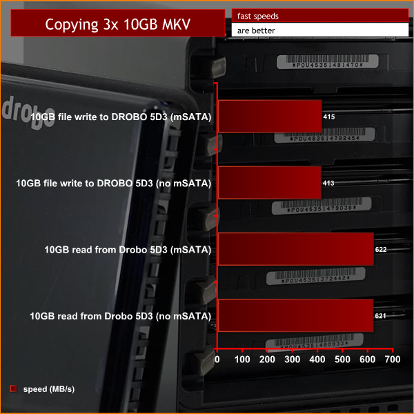 Our first test involves copying 5 duplicates of a 10GB MKV file to and from the Drobo 5D3. We repeat the test 5 times then average the 5 tests to get the final result. We test with and without the mSATA drive installed. All tests have 5x 4TB Toshiba drives installed.