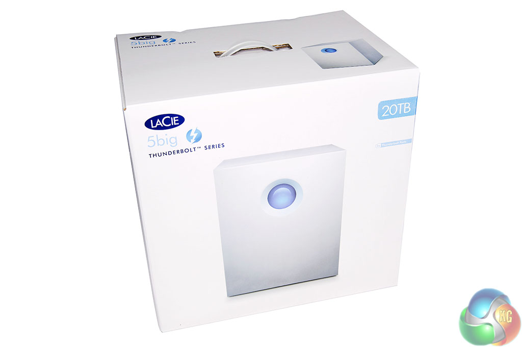 The LaCie 5Big Thunderbolt RAID ships in a large, very heavy white box. On the front is a generic image of the unit. Top right, they list the capacity which in this case is 20TB.