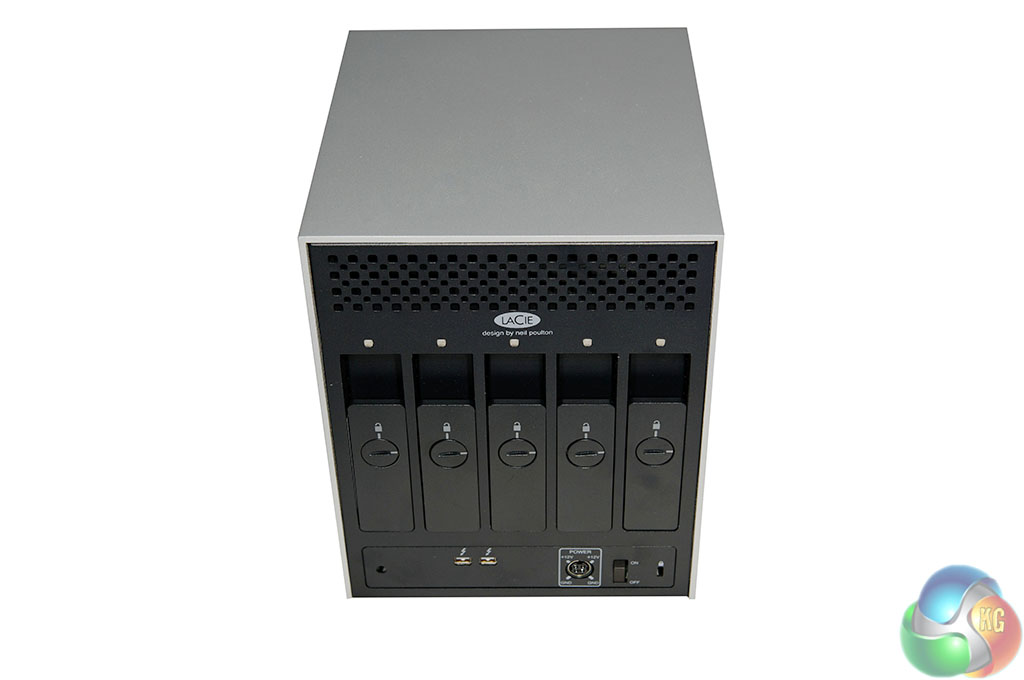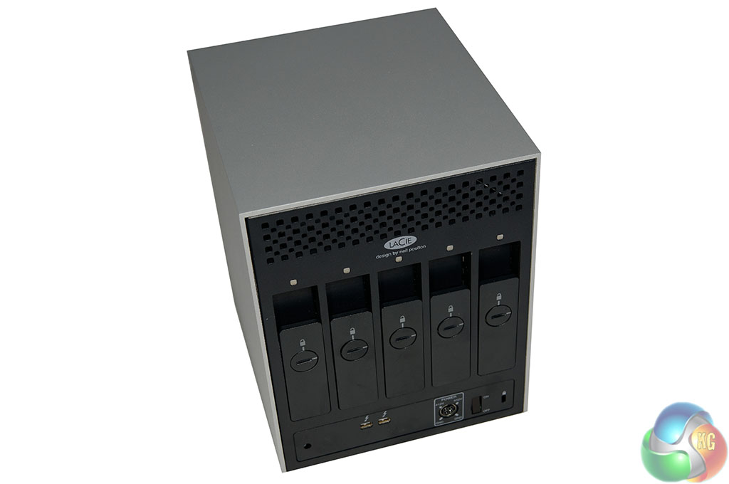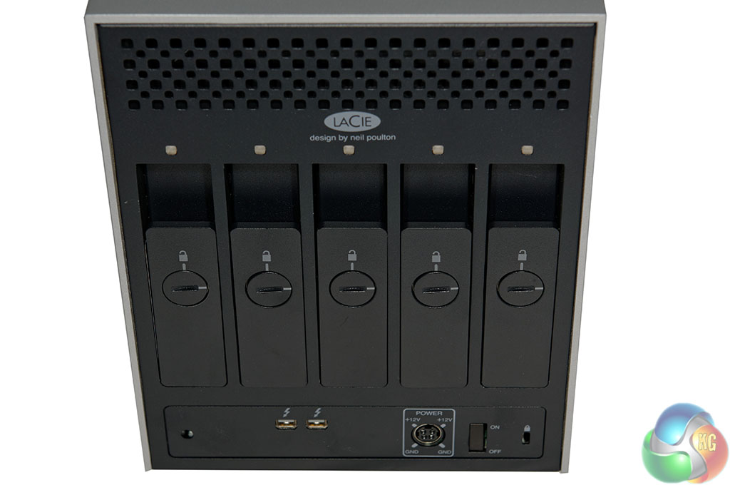 The front of the unit is spartan, with only a futuristic blue light breaking up the monotony, however the rear exposes the five 3.5 inch drive caddies, which are lockable. There are drive status indicators for each drive, a cable management clasp port, Kensington lock port, power supply connector, on/off switch and dual Thunderbolt ports.