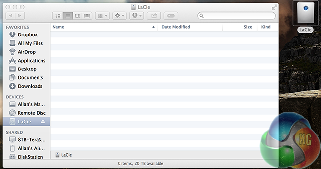 No need to format the drive on OSX Mavericks. It mounts immediately on first start up, with '20TB available'. Pressing the power button on the Apple MacBook Pro Retina switched on the LaCie 5Big 20TB Thunderbolt DAS simultaneously.