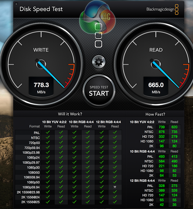 We ran the latest version of BlackMagicDesign ‘Disk Speed Test' on OSX and it recorded a 778 MB/s write speed, along with a 665 MB/s read speed. Remember, there are five 4TB SeaGate Constellation Enterprise class hard drives inside in a RAID 0 configuration.