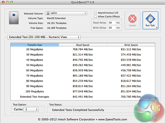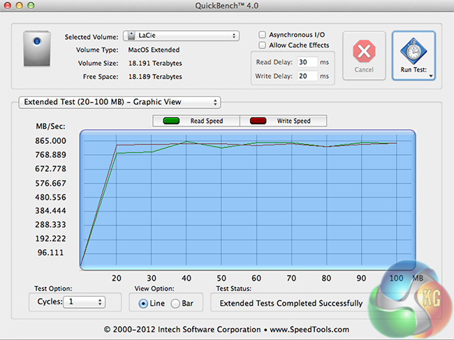 Above, the final extended test results from QuickBench V4.0. The LaCie 5Big 20TB Thunderbolt unit delivered maximum speeds of 877MB/s read and 851 MB/s write. These were repeatable multiple times and much higher than the results from BlackMagicDesign Disk Speed Test.