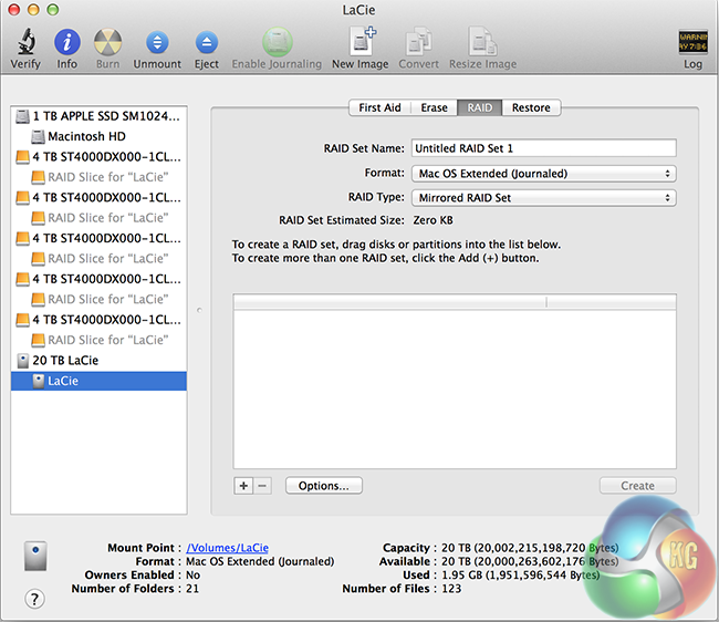 When it is activated with blank drives (installed initially) it will enter into JBOD mode and display a dedicated volume for each drive. Using OSX's Disk Utility means you can change the configuration into RAID 1 for backup redundancy. This will reduce the maximum storage capacity by half (10TB) and also reduce performance.