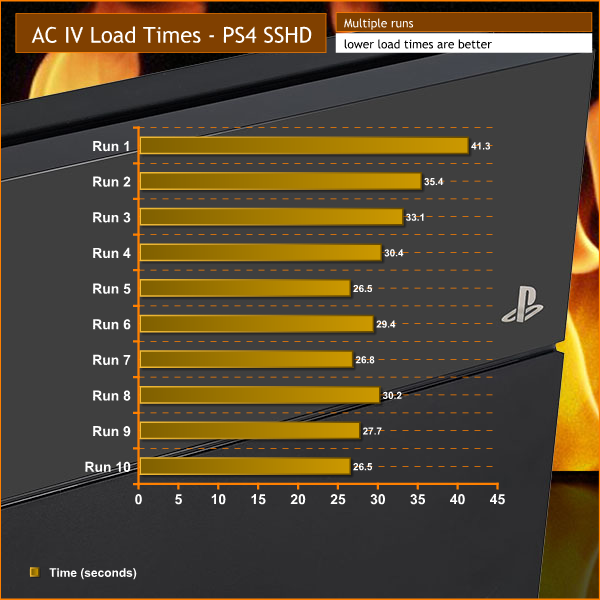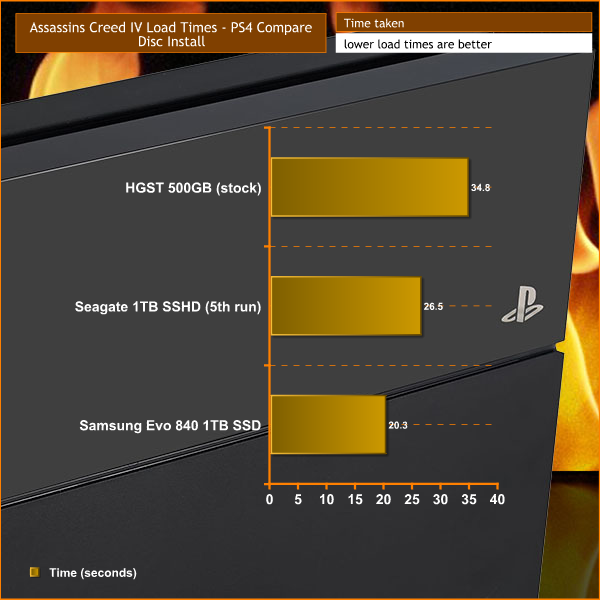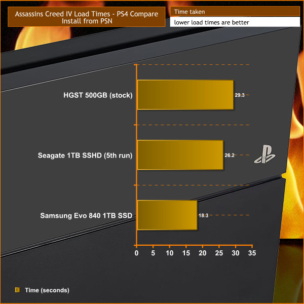 First we want to test just how the Seagate 1TB SSHD works over multiple runs, by installing, then loading and reloading Assassins Creed IV Black Flag. We also bought Assassins Creed IV Black Flag on the PSN store to check speed differences between the disc install version.