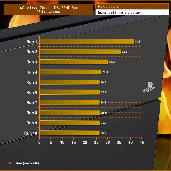 We installed Assassins Creed via the Playstation store, removing the bluray disc from the equation completely (all game data is installed on the internal hard drive). We can see that the times are much more consistent after the fourth run takes place.
